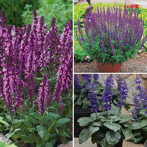 A superb salvia collection featuring three colours that complement each other wonderfully. Their foliage forms clumps of aromatic leaves that give rise to spectacular upright spires that are covered with tiny flowers from June until October. With different heights, they look particularly good planted together, especially in a large pot, but they equally as impressive in borders. All of them are recommended as 'Plants for Pollinators' by the RHS and bees and many other insects will feast on the huge numbers of flowers. Easy to grow and preferring full sun, they are drought tolerant and just need regular deadheading and watering to encourage repeat flowering all summer long. The flower spikes are extremely weather resistant and appear unaffected by wind, rain, or hot, dry spells, and they also make ideal cut flowers. Supplied as 12 plug plants, ready to be potted on or planted out into your garden. You'll receive 4 each of the following: Salvia 'East Friesland' – A beautiful compact variety with narrow spires of vibrant violet blue flowers. Holder of the RHS Award of Garden Merit and. Reaching 45 cm (18 in) in height and spreading 60 cm (2 ft). Salvia 'Big Blue' – Tall racemes packed full of breath-taking bright purple flowers. Growing to 90 cm (3 ft) in height and spreading 60 cm (2 ft). Salvia 'Edula Rose' – Lovely bright pink flower spikes reaching a height and spread of 40 cm (16 in).