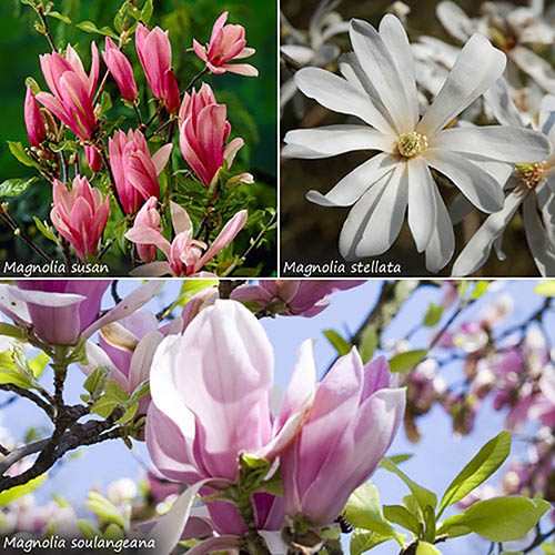 Vibrant Early Summer Colours, Sweetly Fragrant And They Last For Decades Too! Grow Anywhere Magnolia Collection. Create incredible spring displays as early as this April with these stunning Magnolia shrubs. Their heady perfume fills the air and the range of colours and formats makes this a perfect starter collection. And, whilst they love garden soil, they will happily grow almost anywhere – they look stunning in pots on your patio. Despite their connoisseur status, anyone can achieve truly amazing displays with these easy-to-grow Magnolias. Compact and slow-growing, they remain a manageable size for even the smallest garden. Totally winter hardy and perennial, so you can enjoy them year-after-year … for decades! Supplied as a collection, one of each of the 3 gorgeous colours below, of 3 year old pot grown plants 40cm tall:: Magnolia stellata: Breathe in deeply. The large white flowers that burst out of the silky, silvery buds that cover the bare branches of the aptly named Star Magnolia during March and April are deliciously fragrant. Slow-growing and compact (3m (10ft) in height and 4m (12ft) across) this plant will thrive in most soils. Magnolia x soulangeana: One of the most popular magnolias you can grow thanks to a succession of huge, tulip-shaped pinky white flowers that smother the branches of this shrub in mid to late spring. They are shown off to great perfection on the spreading bush as they appear before its dark green leaves. Eventually reaching 6m (20ft) by 6m (20ft) wide, it can be pruned to keep within an allotted area. It prefers acidic soil or pots filled with ericaceous compost. Magnolia Susan: A perfect specimen for a small garden, this medium-sized magnolia boasts narrow, goblet shaped flowers that appear from near purple buds in April. Measuring almost 15cm (6in) across, each deep pink bloom packs a heady scent. It does best in slightly acidic soil or can be planted in containers of ericaceous compost. This upright shrub will grow to 4m (12ft) high by 3m (10ft) across.