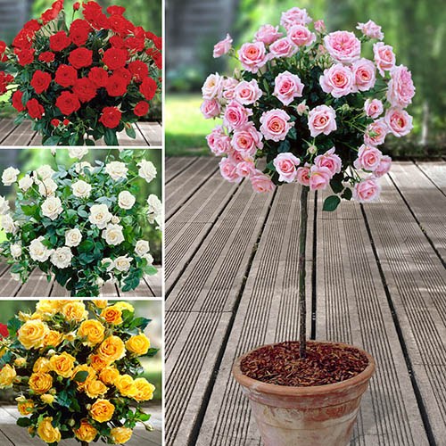 Incredible value, our patio half-standard rose collection will give you beautifully fragrant, premium quality, elegant blooms to enjoy all summer long. This Patio Rose collection is superb value for money, and will produce summer-long displays of beautifully fragrant blooms for years to come. Also known as Tree Roses, they are the perfect way to add height and elegance to your patio – where a single bush will make a dramatic fragrant feature – or as a pair of potted specimens to dress a door or gateway. By 'top grafting' the flowering variety onto the straight stem of the rootstock, thereby giving the height, it takes expert growers a full three years to produce these gems. Rose 'Yellow' produces large, yellow flowers and blooms continuously from early summer to autumn. Rose 'Pink' beautifully demonstrates how the perfect rose should look. Its single, perfect buds are held over glossy green leaves from May to October. Rose 'Red' is a classic red rose with deeply coloured, velvet-like petals through summer and into autumn, which look picture-perfect when spotted with early morning dew. Rose 'White' brings simple, elegant beauty to your garden. Its ice-white petals look particularly striking against its dark green foliage and blooms repeatedly from May to October. This unique Half Standard Rose Collection features 4 roses. Approx 70cm tall, root to tip. NB Colours may vary depending on availability