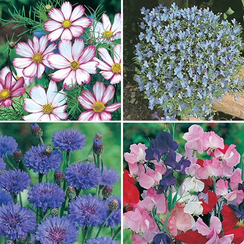 This amazing collection of stunning flowers will fill your garden with blooms all summer long and well into autumn.We've chosen shades of pink, purple and blue that perfectly compliment each other and their different heights mean that there's something for every part of the garden. Mixed together they create a magical cottage garden feel, and they're great for cutting too. Cornflower 'Blue Ball' a gardeners' favourite loved by butterflies and bees, this showy annual is a slender, dainty plant with sky-blue flowers. Perfect for punctuating wild gardens or meadows with colour. Grows to 75cm. 180 Seeds. Sweet Pea 'Galaxy' early flowering in luscious colours from reds to pinks to blues from late spring through to autumn, they'll produce a fabulous succession of beautifully fragrant stems that just keep on coming the more they're cut, so your vases can be as full as your garden with these prolific, long lasting star performers. Growing to 180cm. 35 Seeds. Cosmos 'Candy Stripe' exceptionally free flowering, giving a succession of white blooms with an edging of the deepest pink. With its delicate feathery foliage 'Candy Stripe' makes a lovely cut flower too. Its pollen rich, yellow centres are a magnet for bees on warm sunny days. Grows to 120cm. 100 Seeds. Lobelia 'Cambridge Blue' the perfect filler plant for pots, planters and tubs, or even large scale border plantings. Very easy to grow, its hundreds of sky-blue flowers will wind their way through the gaps in plants, filling them in with ease. A great little essential plant for all planting schemes, Grows to 15cm. 1500 Seeds.