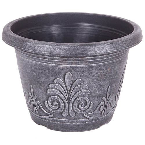 A decorative yet long-lasting, mid-size plastic planter with a really eye-catching design. Hand wash-painted silver over black to create a classic looking pot, it's the perfect planter for a whole host of flowers, trees, shrubs and bulbs. The elegant 'laurel' design with a subtle, metallic finish will suit any garden and it's particularly great for housing bedding and bulbs displays, but can also be used for smaller standard trees and shrubs too. Place by doorways, pathways and patios to create an elegant, contemporary feel. Made from heavy duty plastic that is both UV stable and weather resistant, the 'Laurel' planter is durable and can be reused year after year. Supplied as a single pot 21cm (8.5in) wide.