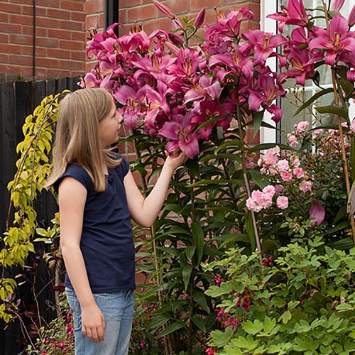 This collection comprises of 3 top sized bulbs, the same as used by commercial flower growers in Holland, of stunning pink coloured Robina. These incredible Skyscraper Lilies grow so tall they look like trees! In their first year they will reach up to 1.5m (5ft) tall, but in future years, once they are fully established, they will get even taller up to 6 or even 7 foot tall eventually! These large flowered beauties arise as a consequence hybridisation between Oriental and Trumpet strains of lily hence the marriage of both species characteristics. Every flower delivers a wonderful heady perfume and each individual stem can carry well over 20 blooms, which can measure well over 15cm (6in) across. Grow all 3 in large pots about 15cm apart, or in groups in garden borders. They have very strong stems, so should not need support. Cut them for the long-lasting displays in the vase, or leave them to marvel at in your garden. Allow them to die down naturally after flowering, and they will build up reserves for even bigger and better displays the following year. Fully Winter hardy, they will last for many years.