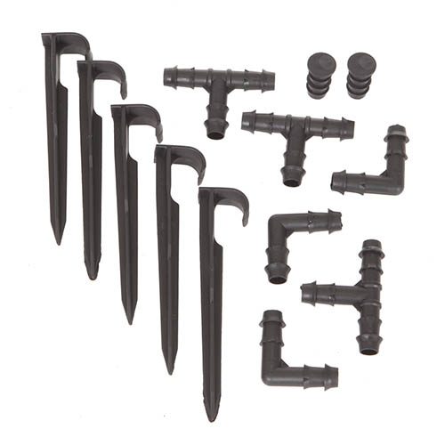 The Handy Connector Accessory Pack contains a special selection of the most popular connectors which will enable you to cut and join and fit the hose to your gardens needs. Go round corners, split into several runs with T pieces. 5 x Stakes to pin to the soil – we suggest 1 every 5M or so. 3 x 90 degree corner Elbows, 3 x 'T' pieces 2 x End Stoppers (one is also included with the hose)