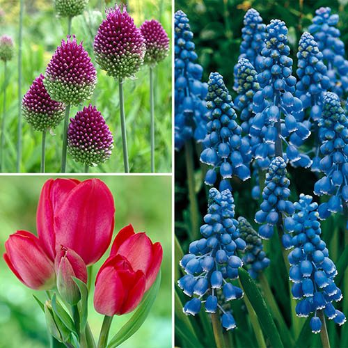 Transform your garden with 4 whole months of fabulous colour each year - from March right through to June, you will be amazed by the dazzling array of colours and variety of shapes from these quite brilliant plants. They are perfect for patio containers and flower borders - and best of all, each of these will naturalise, so you will get bigger and better displays each year, for many years to come! In this collection you will receive: 10 x Red Tulip bulbs - Incredibly versatile, very strong and sturdy, with the classic tulip shape. Flowers: April. Height: 50cm. 20 x Muscari bulbs - The well-loved grape hyacinth, with spikes of deep blue, densely packed flowerheads, great in beds and pots. Flowers: March-April. Height: 15cm. 20 x Allium sphaerocephalon 'Drumsticks' bulbs - Delicate, small, purple-tinged flowers on long, tall straight stems. Flowers: May-June. Height 100cm. 1 x 100g of Blooming Fast Superior Fertiliser. A perfect collection of reds, blues and purples that will look incredible grouped together or planted alone. Supplied as a collection of 50 bulbs, ready to plant out in autumn.