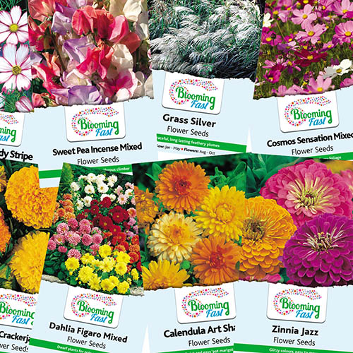 With the gardening year in full swing, it's time to get planting so that your garden will be bursting with colourful flowers all season! Few things are more satisfying than watching seeds that you've planted yourself grow up before your eyes and explode into flower! We've chosen a wide selection of sensational varieties that will all bring colour and texture to your borders, pots and baskets in shades from the hottest reds and oranges to peaceful cottage garden pastels. They're also a magnet for bees, butterflies and other pollinating insects that will find the nectar rich flowers irresistible. Gorgeous in the garden and also indoors in vases, you'll have hundreds of dazzling blooms for month after month, and they're so easy to grow too! You'll receive three individual packets of seed, chosen from: Silver Grass Miscanthus Sinensis – A tall, epic perennial grass with silvery seed heads. Poppy L'auren's Grape' – Rich, deep purple flowers. Zinnia 'Jazz' – Showy double flowers in bright shades of pink and orange. Dahlia 'Figaro' Mixed – A dazzling display of yellow, orange, red, pink, white and purple double blooms. Stock Night-Scented 'Starlight Scentsation' – Pastel shades with a fragrance that intensifies at dusk. Marigold (African) 'Crackerjack' – Flowers in hot shades of orange and yellow. Cosmos 'Sensation Mixed' – A cottage garden favourite in magenta, pink and white. Sweet Pea 'Incense Mixed' – Exquisitely scented pastel flowers. Calendula 'Art Shades' – Double blooms in peach, orange and yellow. Californian Poppy 'Monarch Art Shades' – Drifts of flowers in shades or orange. Lobelia 'Cambridge Blue' – Masses of vivid blue flowers. Cosmos 'Candy Stripe' – Daisy-like white flowers edged in deep pink.