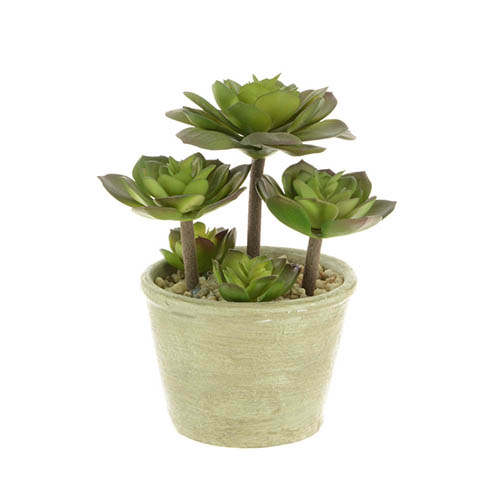 This stunning succulent plant will lend the perfect finishing touch to any room. Bang on trend, it will look fantastic on shelves, windowsills, and side tables. This succulent will make a perfect gift idea for Christmas, Birthdays, Anniversaries, or any other special occasion that will last forever. Needing no maintenance there is no chance that you can kill it! What more could you want or needs? This artificial plant has five separate succulent plants, three on taller stems to create a lovely effect. It comes complete with a very modern and stylish concrete style pot. Supplied as 1 x artificial plant, 19cm tall in a decorative pot.