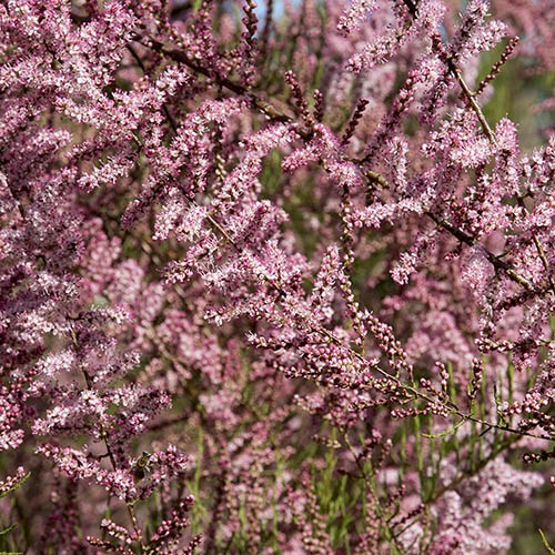 Tamarix tetrandra, more commonly known as the Tamarisk or Salt Cedar, is a deciduous shrub or small tree grown for its incredible spring flowers. Gracefully arching dark, almost black branches with needle-like foliage explode into masses of feathery plumes of tiny blossom in shades of pink during March and May. These amazing flowers will completely cover the plant creating an enchanting effect in the spring garden. Fully deserving of its coveted RHS Award of Garden Merit, you can be sure that this is a proven garden performer, guaranteed to be suitable for UK gardeners at every level of experience. You can therefore plant this in the garden with confidence, for a beautiful display for years to come. Thriving in full sun or dappled shade, Tamarisk needs nothing more that occasional pruning to removed dead or crossing branches and to keep it in shape. It is completely hardy to -15°C, so it will withstand the worst of winter weather. Supplied as an established plant in a 2 L pot, ready to plant, growing to a height and spread of 3 m (10 ft).