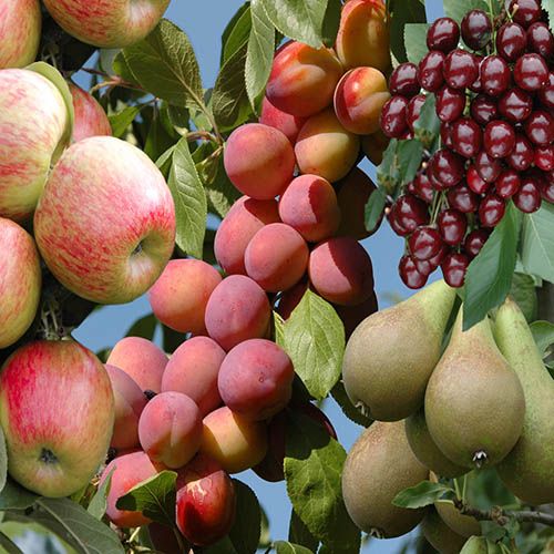 Scrumptious! You can now pick abundant crops of delicious plums, apples, pears AND cherries from your own orchard fruit collection! These "grower-quality" fruit trees mean YOU can now grow full-sized crops in your garden or even in pots on your patio! What's more, you may even pick your first juicy fresh fruit in the first year! You should start to see an increase in this crop year on year, with a potential to provide a high product yield costing only pennies per lb to produce.They're "self-fertile" and grown on 'Dwarfing' rootstocks so they so will pollinate themselves and always be compact. The beautiful, fragrant blossom in spring will precede the fruits, with 'Victoria' and 'Stella' cropping from July, 'Conference' in September and 'Braeburn' in October.Delicious fresh from the tree, they also make perfect jams and preserves or can be stored for later use – 'Conference' and 'Braeburn' will even keep until Christmas!