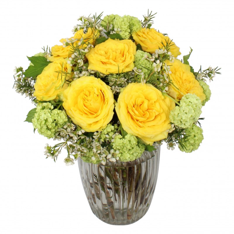 Bring a smile to the face of your friends and family with this wonderful bouquet. A fusion of bright yellow roses, viburnum and budding wax flower, it’s the perfect statement of friendship and warm feelings