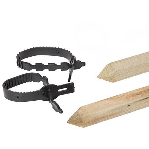 Protect your investment in fruit trees, with our high quality, easy to use and low cost tree planting kit. Comprising two treated and tanalised softwood support stakes, each 1.2m long x 3.2cm across, and two super-soft 38cm long rubber tree ties, to firmly hold the tree trunks in place while the root system establishes. Supplied as 2 x 1.2m long x 3.2cm wide stakes and 2 x 38cm rubber tree ties.