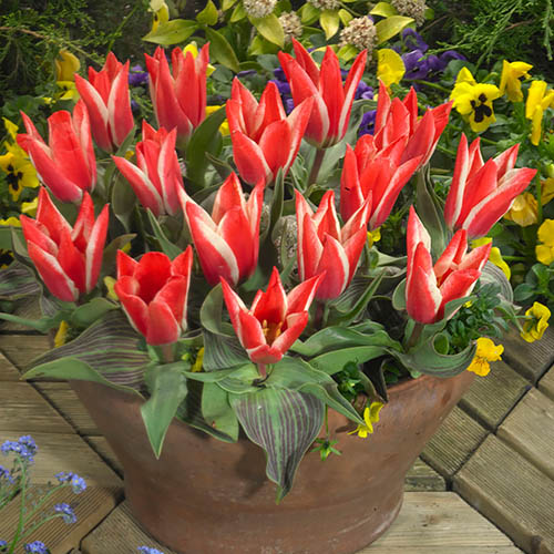 'Pinocchio' are amongst the first tulips to come into flower, beginning in March. A dwarf variety, what they lack in stature they certainly make up for in colour from both their flowers and their foliage. The leaves are grey-green and heavily striped with maroon, creating an instantly unusual and striking appearance. The flowers are stunning, with bright red petals edged in creamy white. The flowers, at about 10 cm (4 in) across, are surprising large in proportion to the plant's height. They are an excellent choice rockeries or borders, where they will naturalise, growing in number year after year. They are ideal in patio pots and window boxes, and as these are a dwarf tulip, they will withstand strong spring winds better that taller varieties, looking perfect throughout their flowering period. Also, they're wonderful cut flowers, perfect for brightening up your home. Tulips are easy to grow and care for and can be left in the ground after flowering as long as it's well drained, so you'll get another wonderful display the following year. Supplied as 15 bulbs, size 10/11, ready to plant in autumn, growing to a height of 20 cm (8 in) and width of 10 cm (4 in).