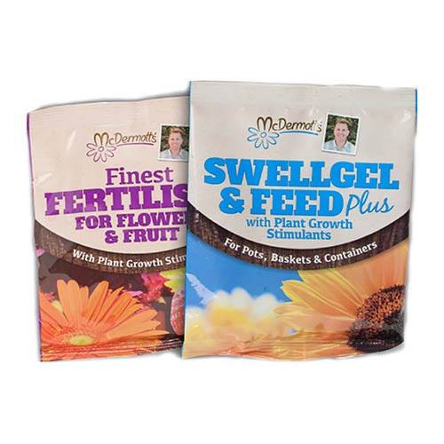 Try our two best-selling plant feeds and experience the ultimate in feed and fertiliser for your potted, basket and container plants! McDermotts SwellGel & Feed PLUS This brand new and exclusive product represents the very best of commercial plant food and water retention technology and is based on over 25 years of Peter's hands on experience of growing plants within the horticultural sector. McDermotts SwellGel & Feed PLUS is the complete food and drink for your plants and hanging baskets, and has been specially formulated to work even better than its next best competitor! A true garden essential, it contains an especially formulated high water absorption crystal, which locks in water and swells up to a gel in your hanging baskets, tubs and pots. McDermott's Finest Fertiliser Containing all of the important nutrients that are essential to look after shoots, roots and flowering and fruit yield for bigger crops and floral displays. McDermott's Finest Fertiliser is the only plant food you will need this year for all your crops, and is the equivalent of your total multi-vitamin plus a healthy diet for your plants, all wrapped up in a single product! It contains all of the important plant nutrients that are essential for that perfect look and professional results.