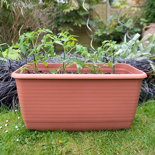 This innovative terracotta style planter has been designed to help you to produce exceptional crops of delicious vegetables as easily as possible and is also perfect for herbs, salads and summer flower displays. With this trough, your plants will literally look after themselves. It features a large 7.4 litre water reservoir that will keep your plants watered for up to 14 days, allowing plants to drink water as and when they need it, perfect for when you're away on holiday, and you can't over water because of the clever overflow system. There's even a watering point allowing you to fill the reservoir from the bottom, so the water goes just where it's needed. It also incorporates a unique support system for your canes, particularly useful when growing vegetables and other tall plants. Simply slot one of the green plastic-coated metal canes supplied into each of the three holes in the base of the trough. Each cane is 65 cm (26 in) long and as your plants grow, they can be lengthened by joining extra canes onto them using the connectors provided, so no more wobbling canes in growbags! With a capacity of 41 litres of compost to ensure your plants have space to produce a robust root system, they'll be kept healthy and will grow to their full potential. Made from frost resistant, UV stable plastic, 63.5 cm (2 ft) long, 34 cm (13½ in) wide and 33 cm (13 in) high, weighing 2.5 kg with a capacity of 41 litres. Complete with 6 x 65 cm (26 in) green plastic-coated metal canes and 3 x cane connectors.