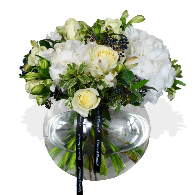 Combining white hydrangeas and elegant white roses, there’s something deceptively simple in the composition of this bouquet. Tying in fresh alstroemeria flowers as well as flashes of dark viburnum berries and pittosporum, we think this bouquet is set to stand the test of time.